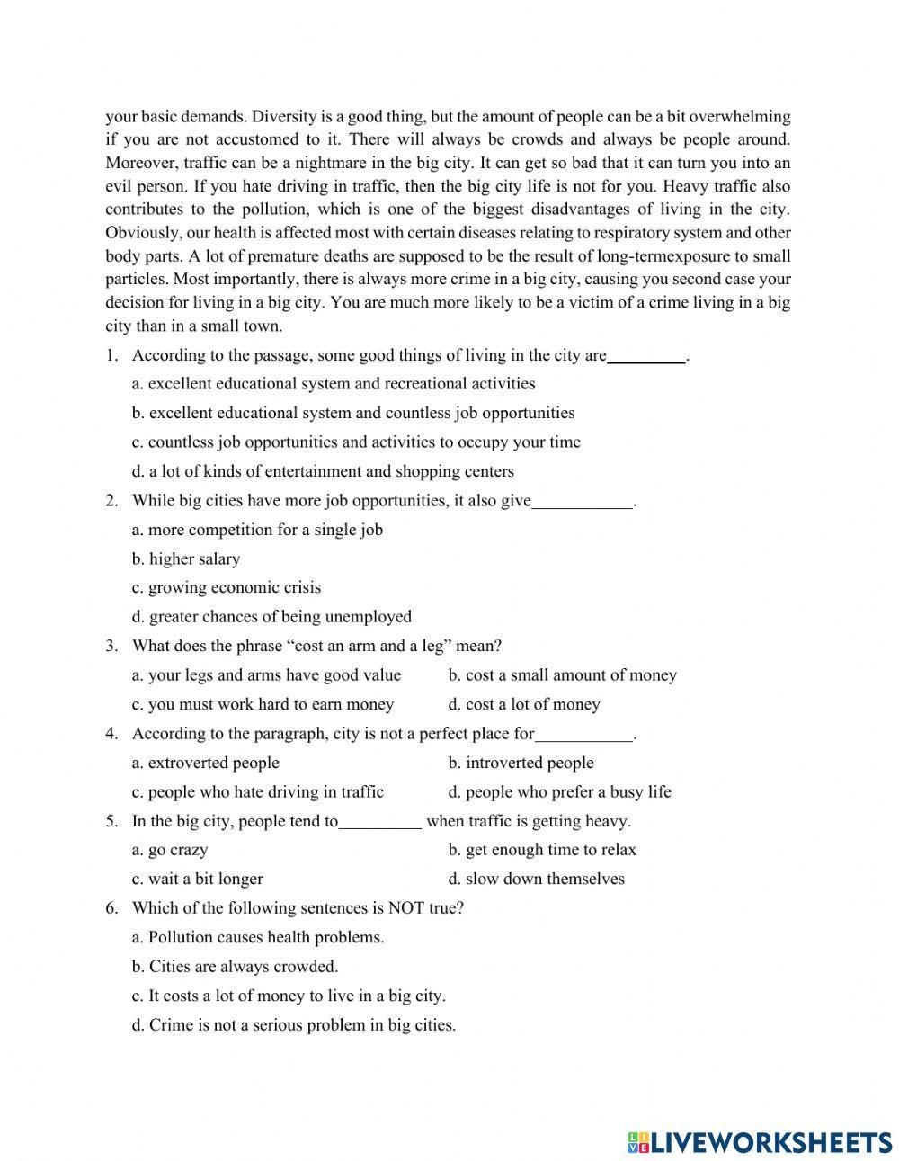 Grade 9 City Life Reading Comprehension Worksheet Live Worksheets Library
