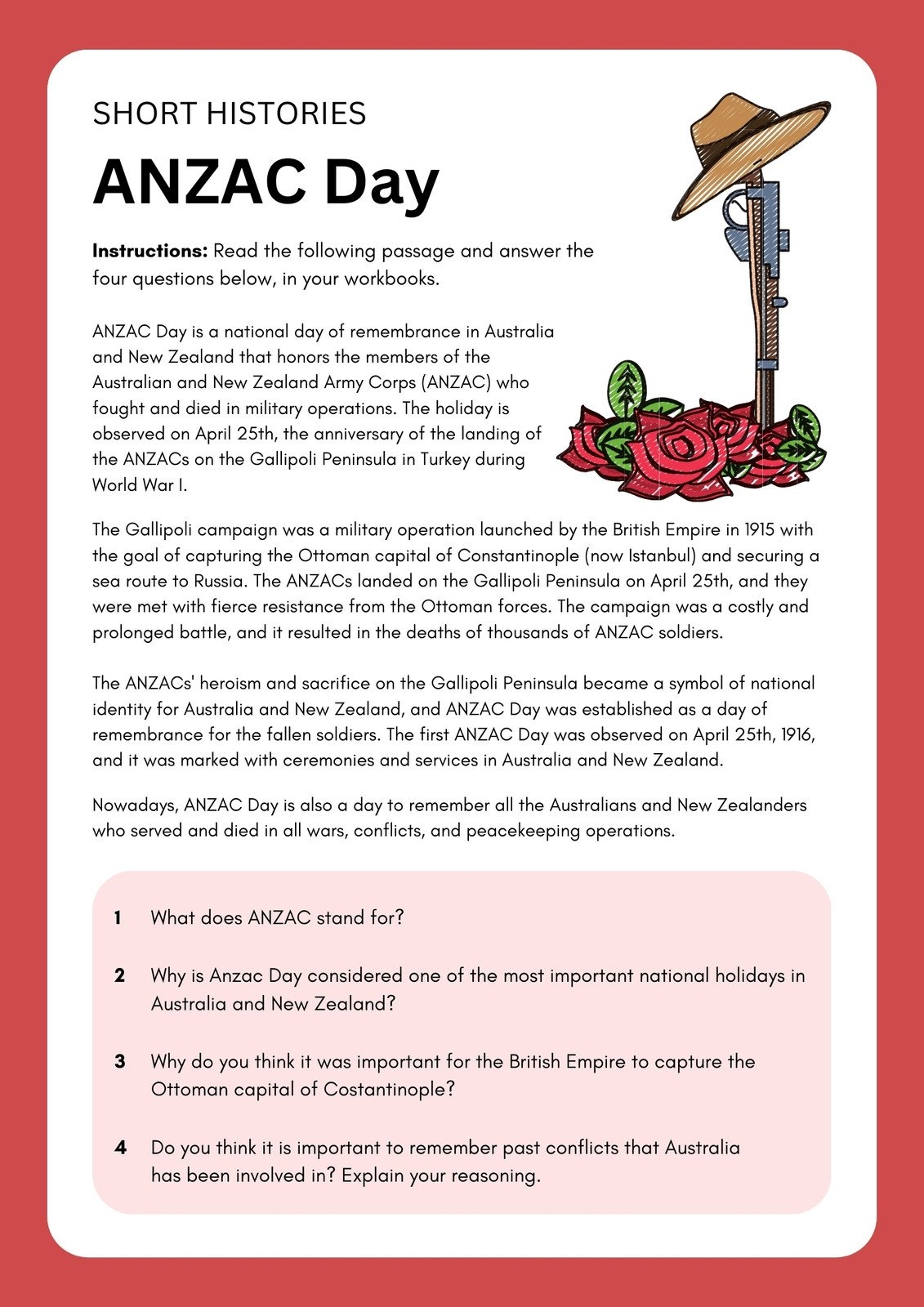 One way to educate children about Anzac Day is through reading comprehension worksheets. These worksheets help kids learn about the history and significance of the day in a fun and engaging way. They can improve reading skills while also teaching important historical facts.