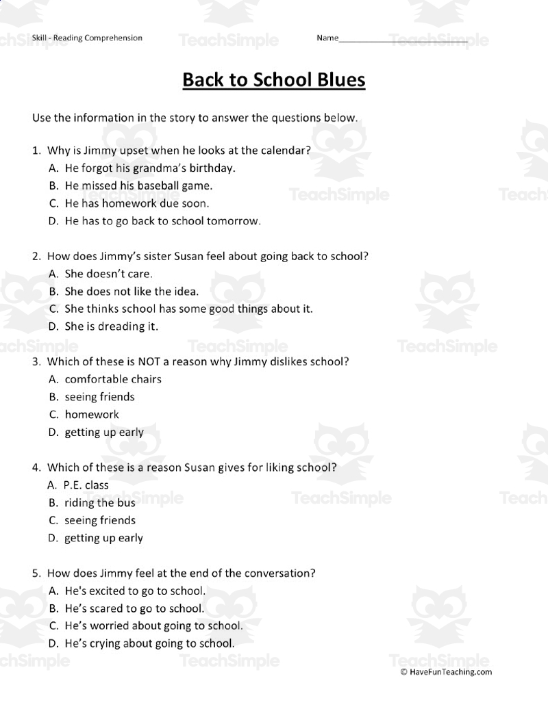 Reading Comprehension Back To School Passages With Answers