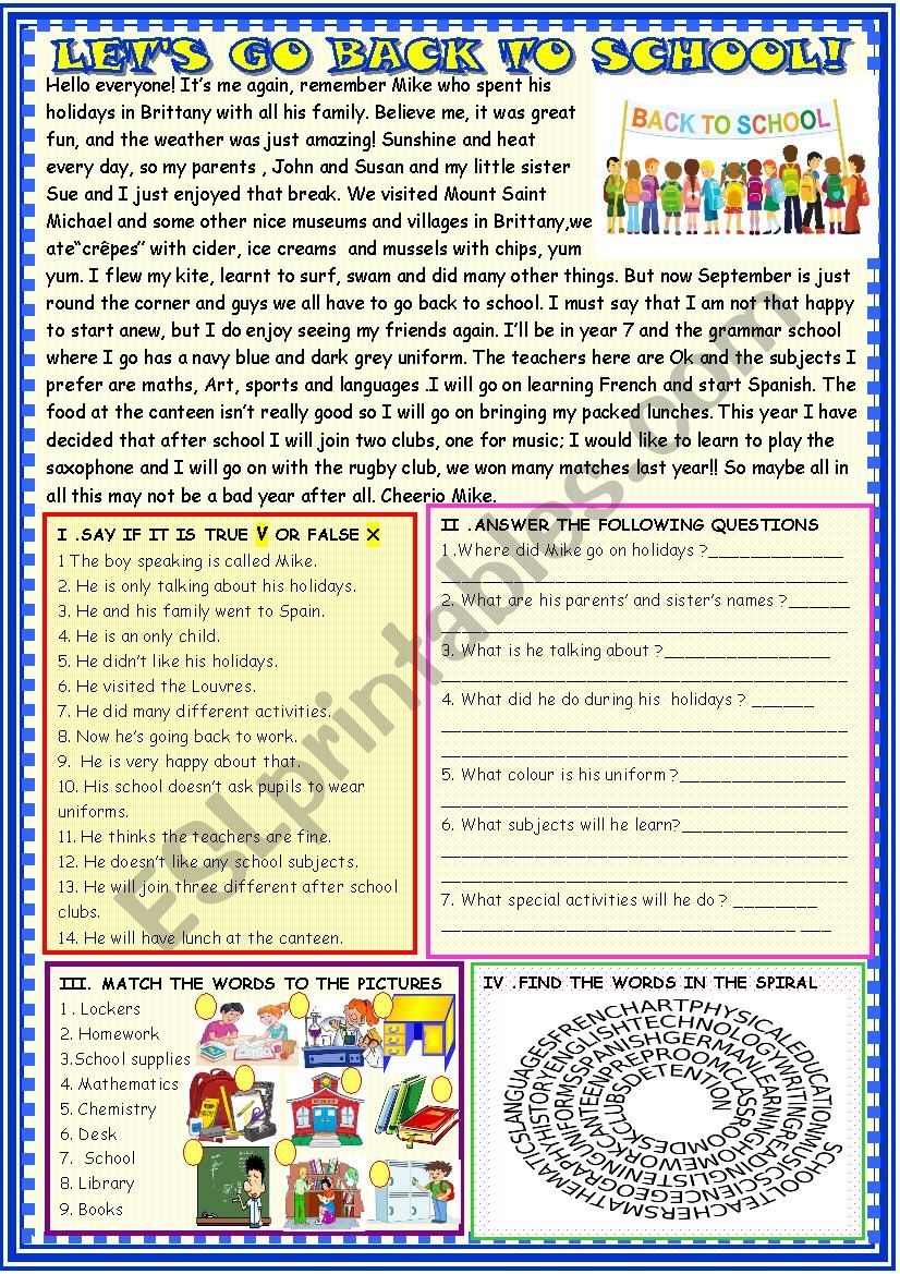 Let s Go Back To School Reading Comprehension ESL Worksheet By