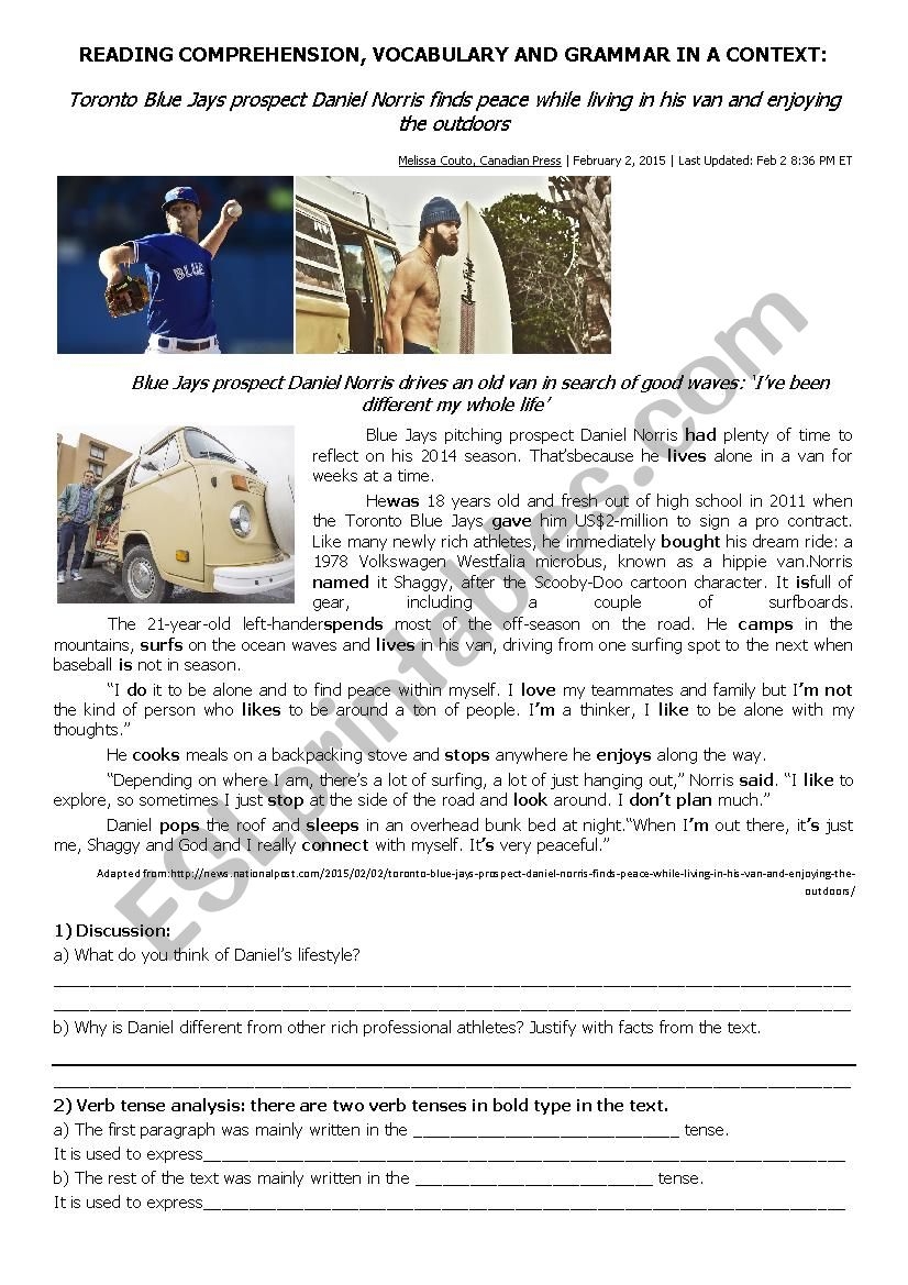 Reading Comprehension Baseball Player Living Off The Grid ESL Worksheet By Profemadelon
