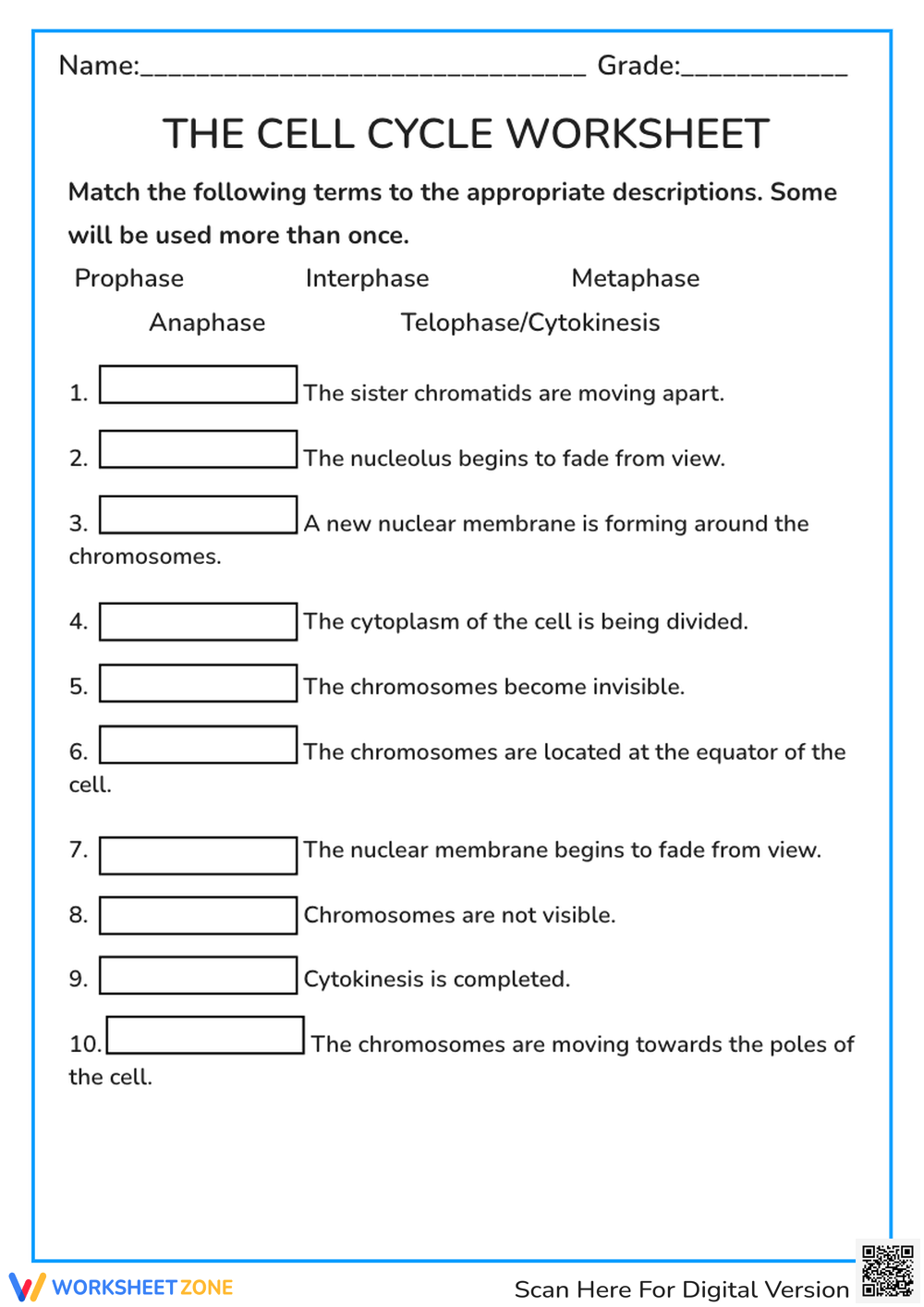 This worksheet is designed to test students’ understanding of the different phases of the cell cycle. It includes questions that challenge students to recall and apply their knowledge of cell division, making learning engaging and interactive. It’s a great tool for both teachers and students alike.