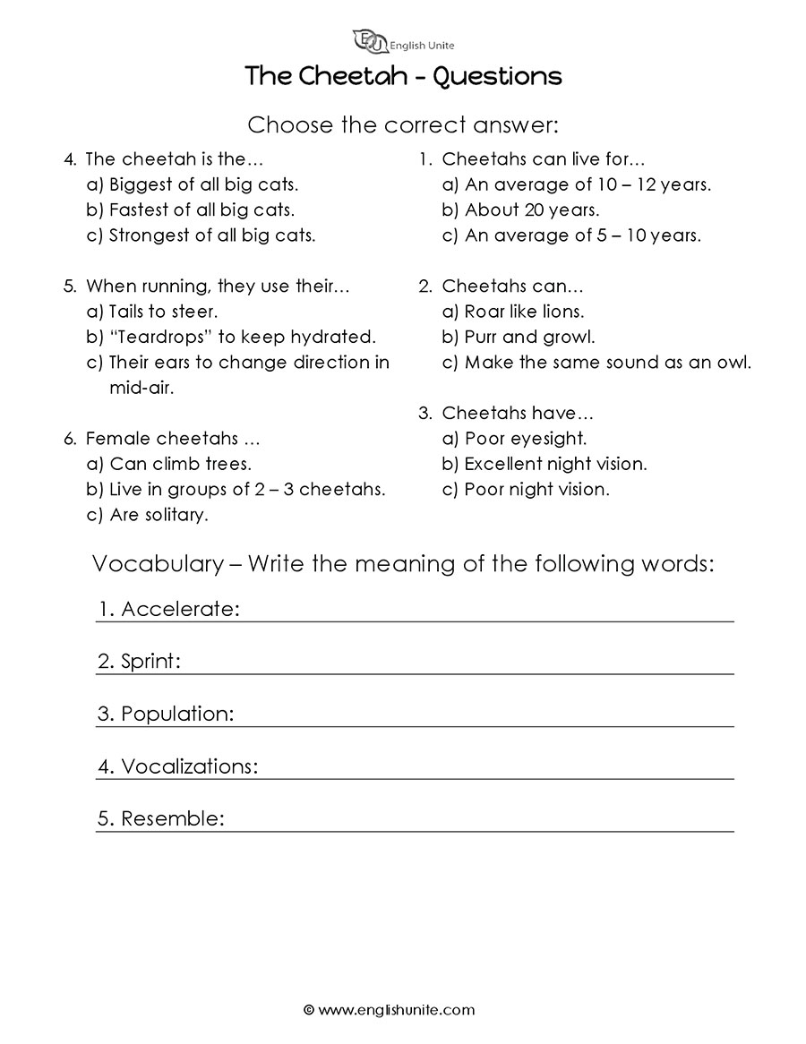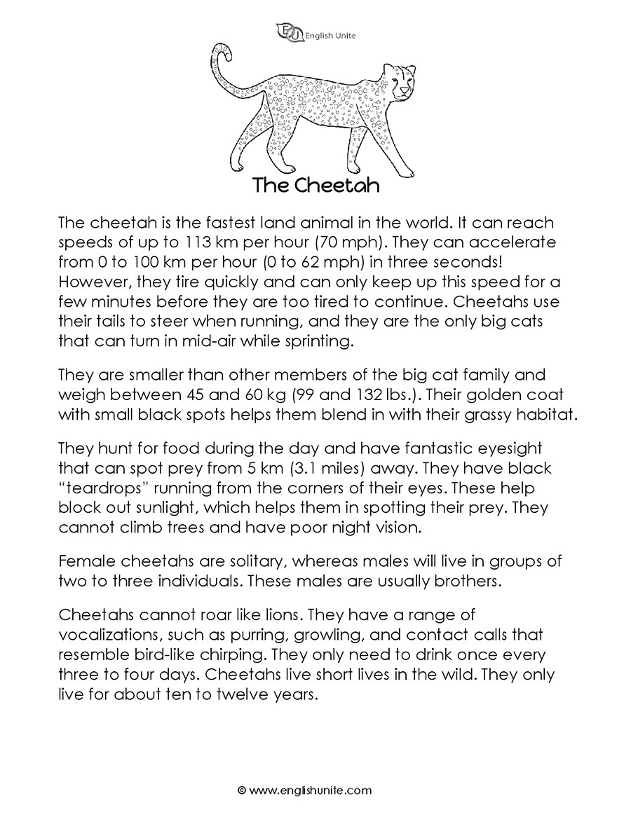 Cheetah Reading Comprehension Worksheets