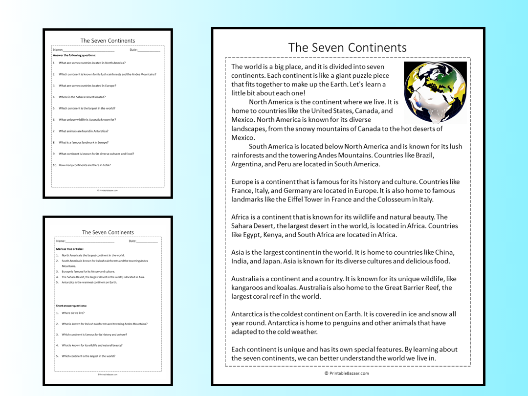 These worksheets are designed to be both informative and entertaining, with passages that cover a variety of topics related to the continents. From interesting facts about each continent to comprehension questions that test understanding, these worksheets are sure to keep kids engaged.