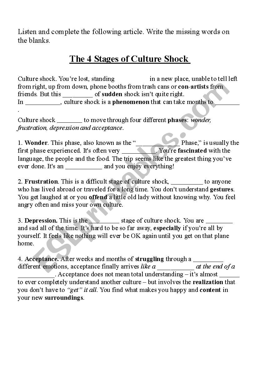 Culture Shock ESL Worksheet By Tchrkaren
