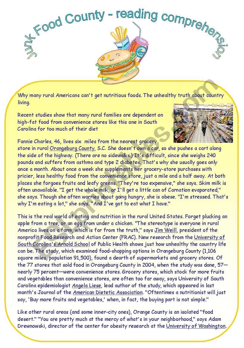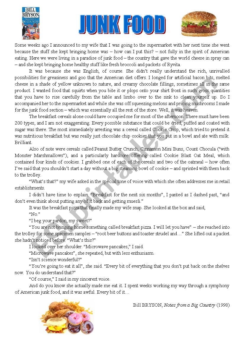 Reading Junk Food ESL Worksheet By Englishteacher60