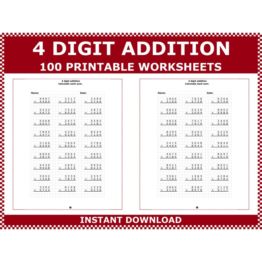Addition Worksheets Adding 4 digit Numbers In Columns Addition 4 Digit Worksheets 3rd Grade 4 digit Plus 4 digit Addition By Acminimalist Etsy Norway