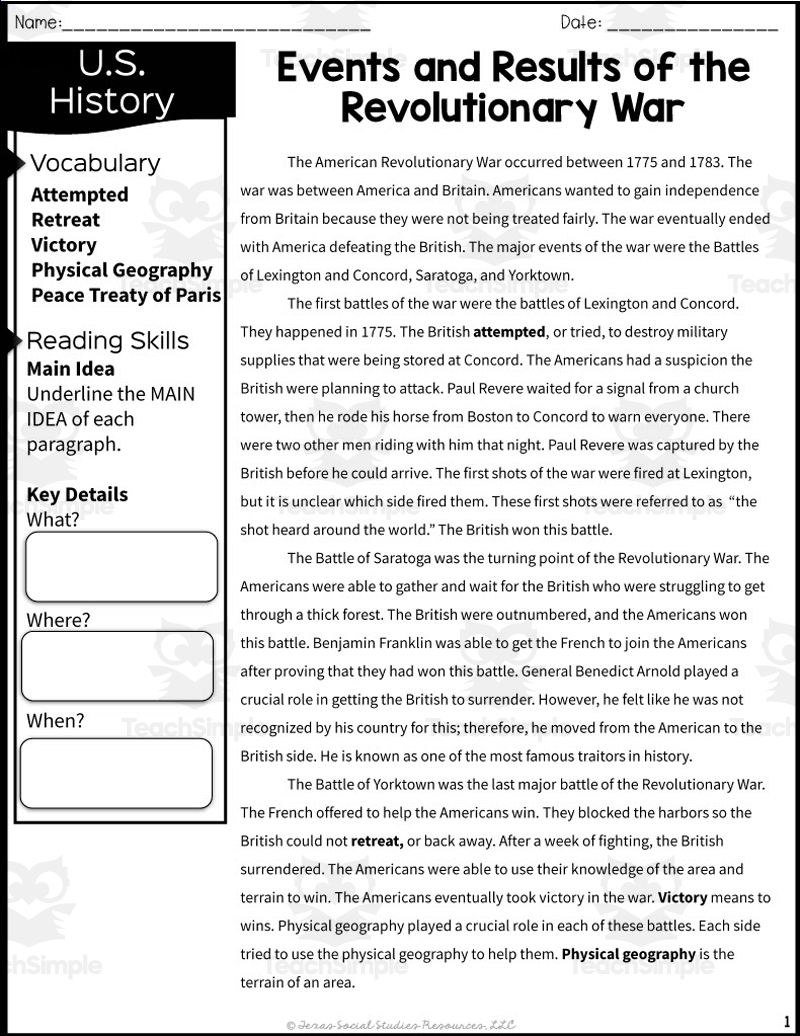 Events Of The Revolutionary War Reading Packet By Teach Simple