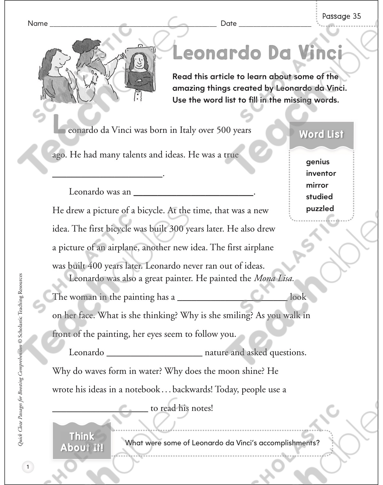 Leonardo Da Vinci Quick Cloze Passage Printable Skills Sheets Lesson Plans And Ideas