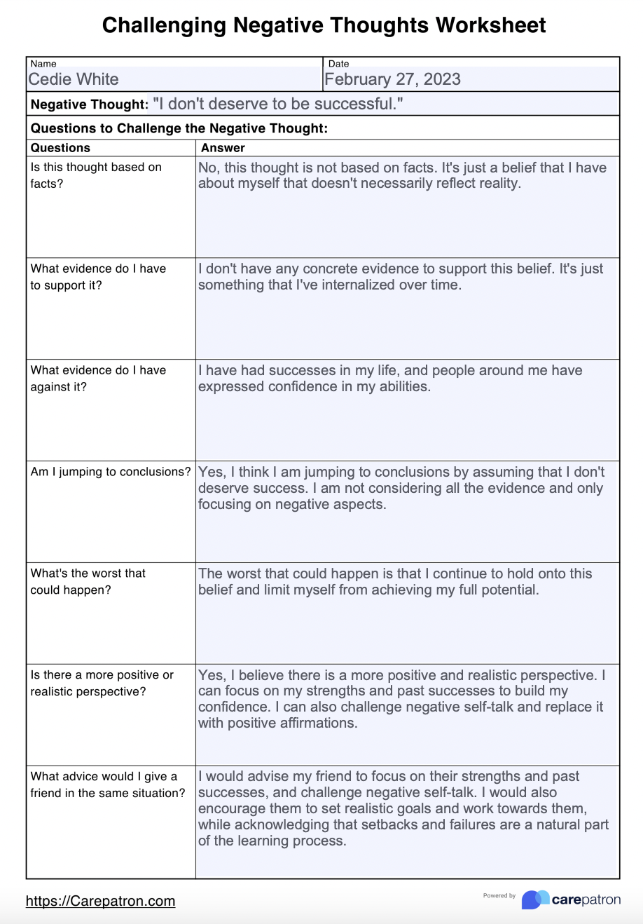 Negative Self Talk Worksheet U0026 Example Free PDF Download