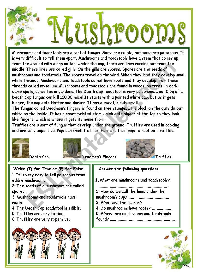 Mushrooms Facts Reading Comprehension ESL Worksheet By Alexiosthegreat